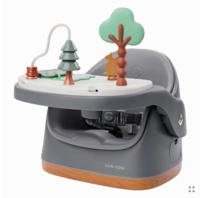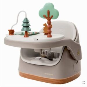- Asiento elevador 3 en 1: Se transforma en asiento de suelo e incluye una bandeja de actividades con juguetes para estimular y divertir.